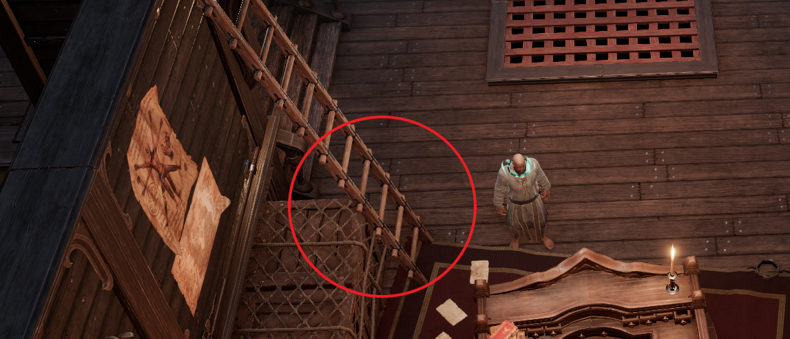 사다리를 이용하여 배 위층으로 올라가도록 하자.