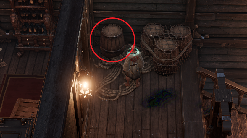 문을 열기 전에 문 오른쪽에 있는 나무통을 살펴보면 주머니칼을 얻을 수 있다.
