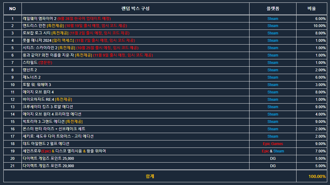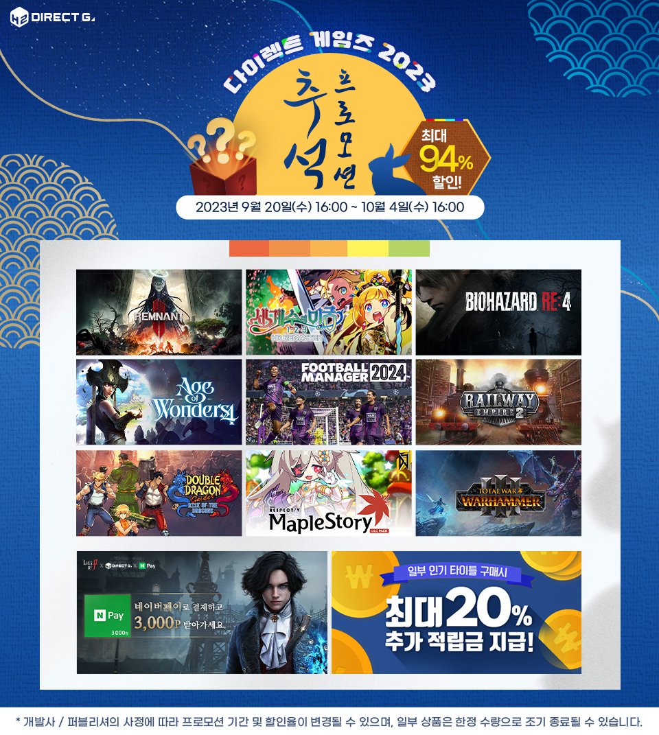 | [~2023년 11월 6일] 다이렉트 게임즈 2023 할로윈 프로모션 (0) | 2023.10.28 |
