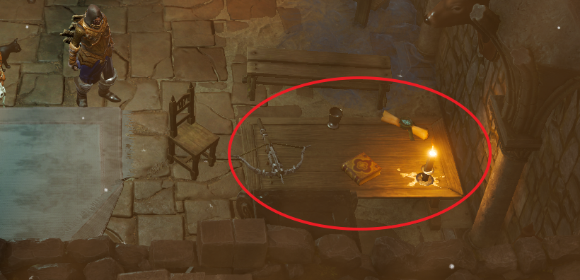 테이블에 피투성이 사슬 장갑과 정신지배 구더기가 담긴 단지(정신 지배 수류탄 재료)가 있으니 필요시 챙겨가자.