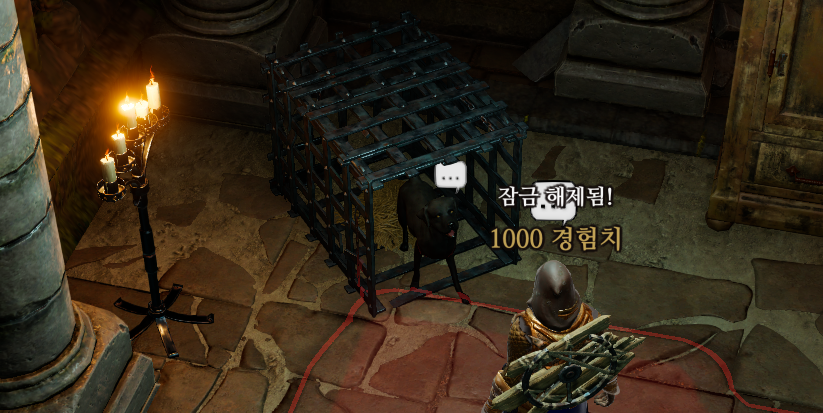 일행은 1000 경험치를 얻으며 갇혀 있던 개와 대화를 할 수 있다. (동물 친구 재능 필요)