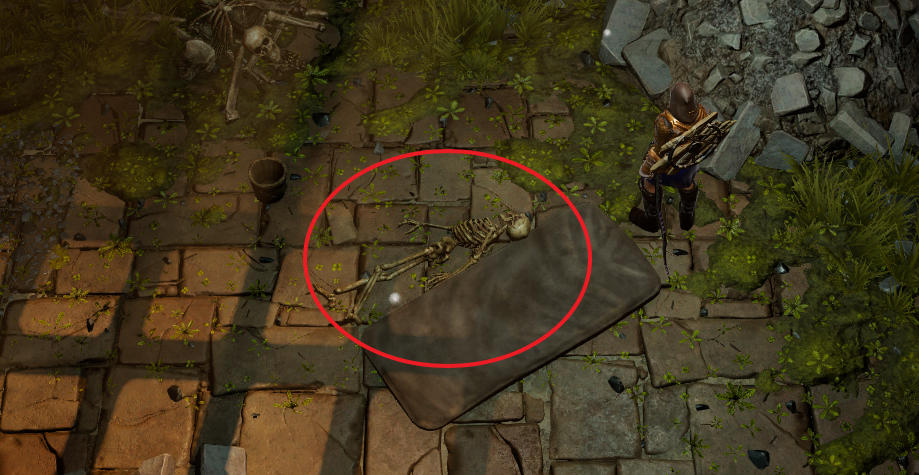 3번 위치에서 위쪽 고지대를 이용해 옆 방으로 넘어오면 해골 시체가 한 구 보일 것이다.