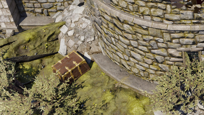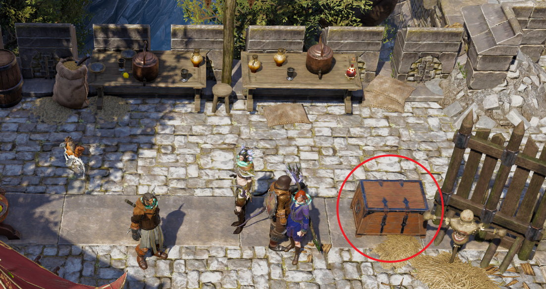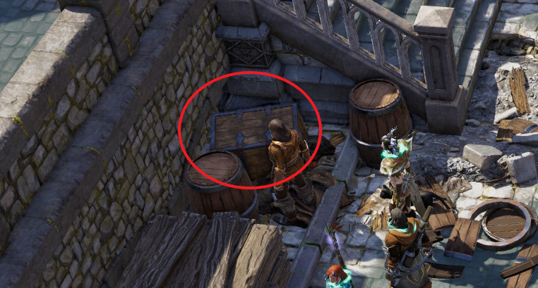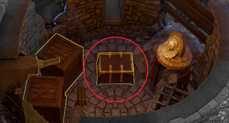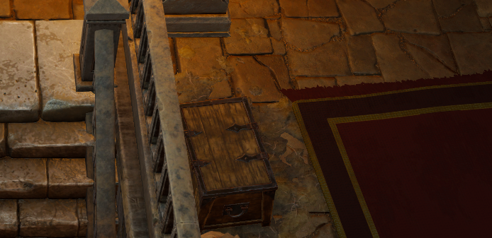 계단 틈 사이에는 상자가 하나 있다. 마지스터 시체에서 얻은 항구 열쇠로 쉽게 열 수 있다.