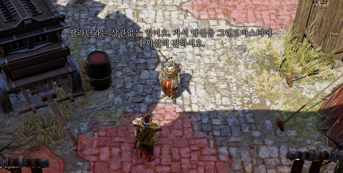이번엔 시작 위치에서 위쪽 문을 열고 위로 올라가면 팔라딘 코르크가 마지스터와 실랑이를 벌이고 있다.