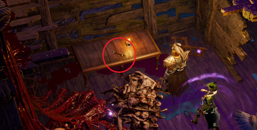 처치 후 왼편에 알이 있는 곳 근처 테이블에서 통 저장고 열쇠를 얻을 수 있다.