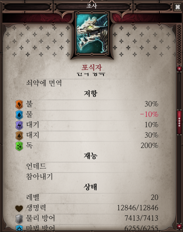 포식자는 다음 능력치를 보유하고 있으니 전투시에 참고하자.