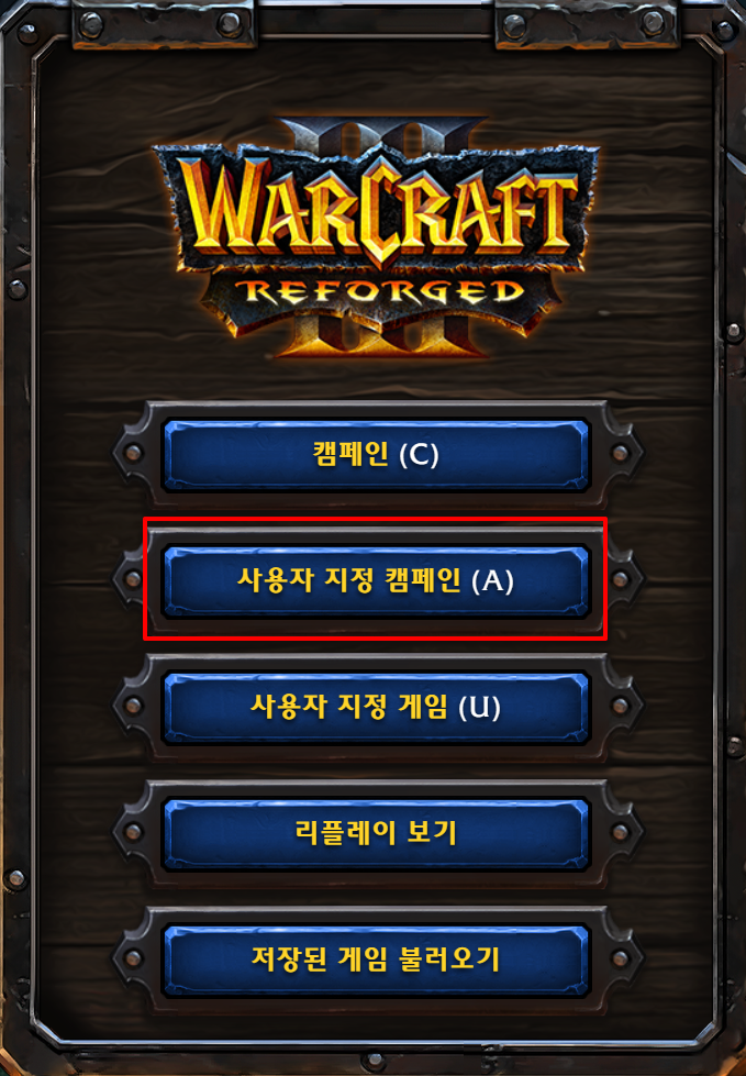 우선 워크래프트 3: 리포지드를 실행하고 싱글플레이 메뉴에 들어가면 사용자 지정 캠페인이 있다.