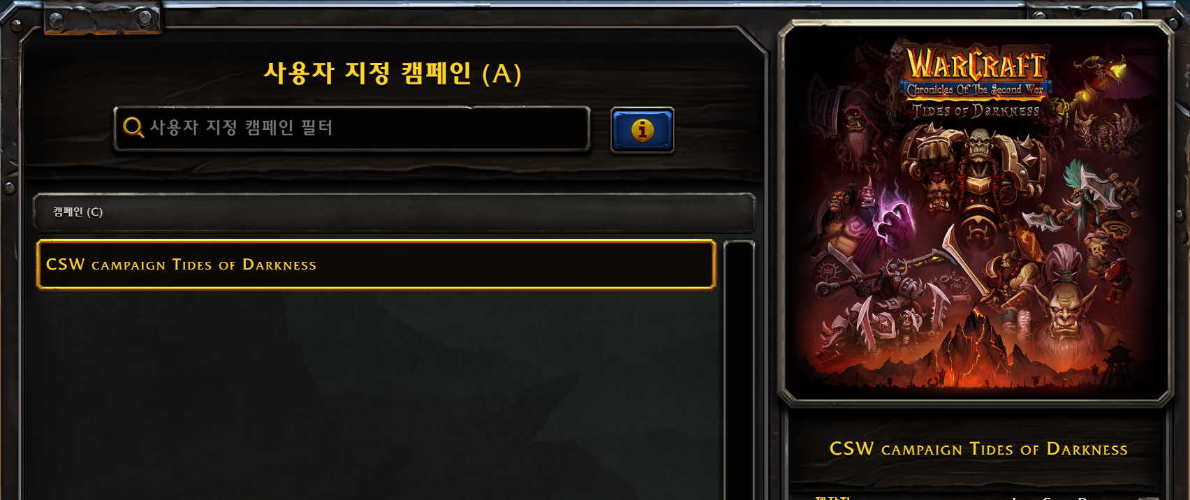 내 문서\Warcraft III\Campaigns(폴더 생성) 경로에 CSW_tides_Of_darkness_EN 파일을 이동시키자.