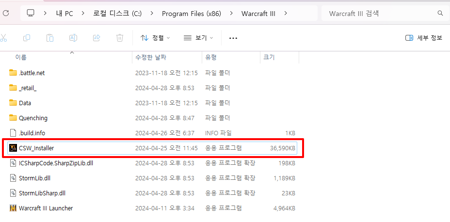 그리고 두 번째로 다운로드 받은 리소스 파일 중 CSW_Installer를 워크래프트 3 설치 경로에 이동시키자.