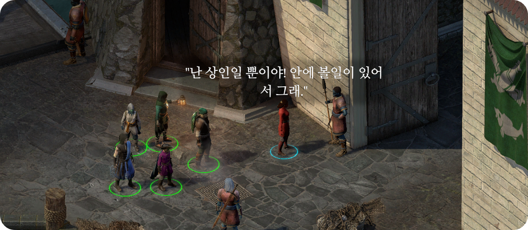 경비병과 상인의 말다툼을 벌이는데 한 사람의 편에 설 수 있다.