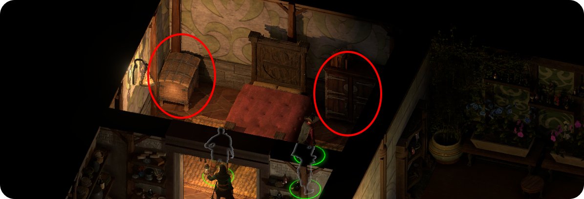 상점 안쪽 방에서는 잠긴 상자(자물쇠 난이도: 5)에서 아이템을 챙길 수 있다.