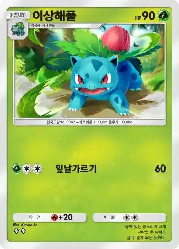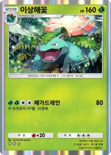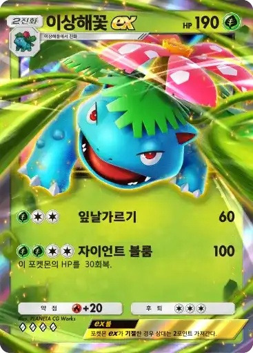 이상해꽃 ex | ⬛⬜⬜ 잎날가르기 (60) ⬛⬛⬜⬜ 자이언트 블룸 (80) ※ 추가 효과: 이 포켓몬의 HP를 30회복 |