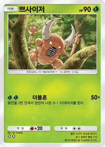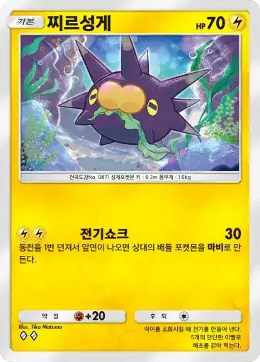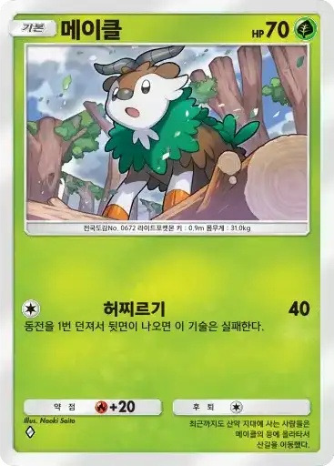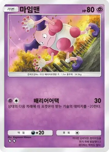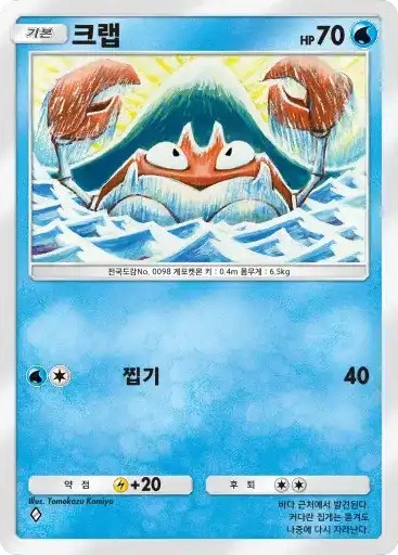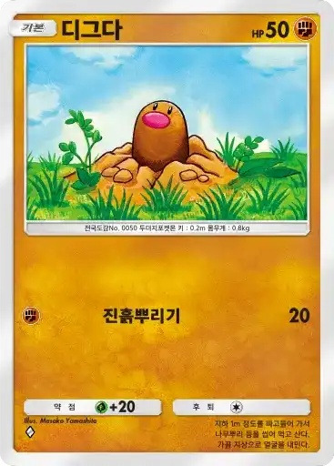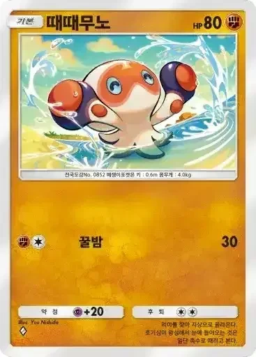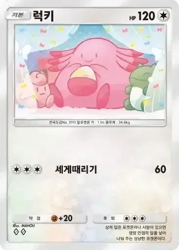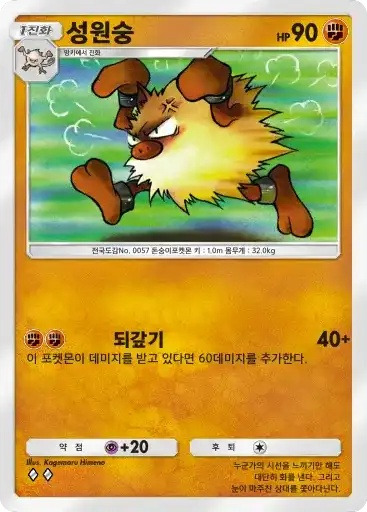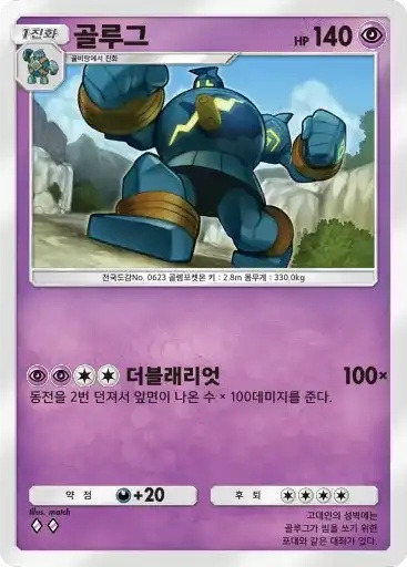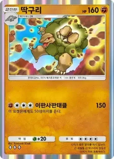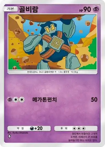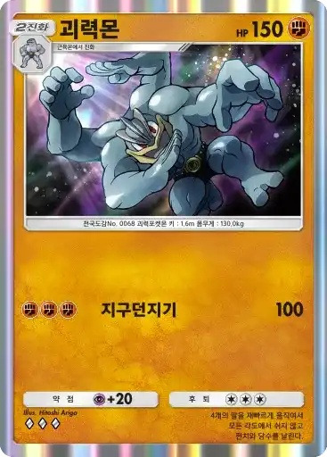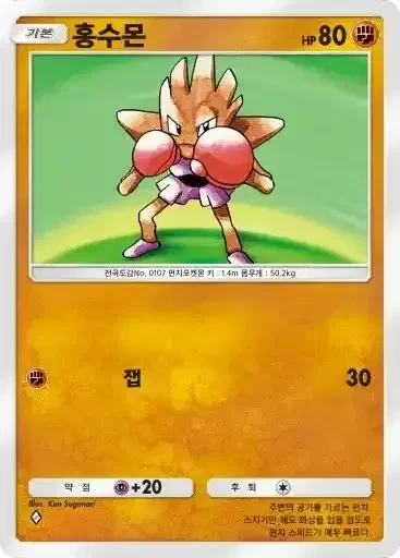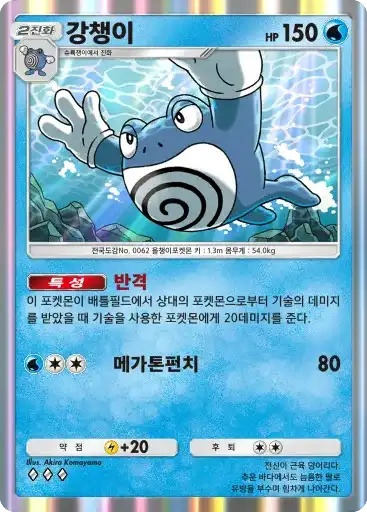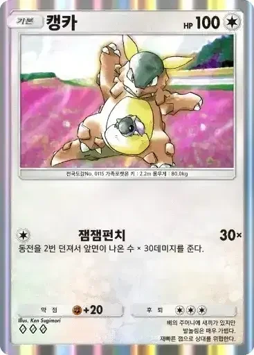 강챙이 | 특성: 반격 (이 포켓몬이 배틀필드에서 상대의 포켓몬으로부터 기술의 데미지를 받았을 때 기술을 사용한 포켓몬에게 20데미지를 준다.) ⬛⬜⬜ 메가톤펀치 (80) |