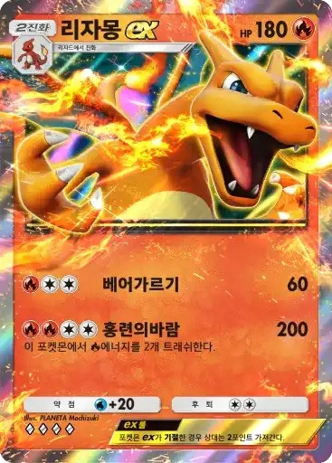 리자몽 ex | ⬛⬜⬜ 베어가르기 (60) ⬛⬛⬜⬜ 홍련의바람 (200) ※ 추가 효과: 이 포켓몬에서 불 에너지를 2개 트래쉬한다. |