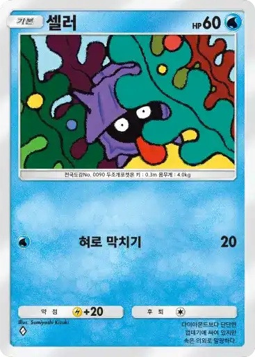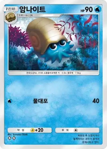 조개화석 | 이 카드는 HP40의 기본 타입의 기본 포켓몬으로서 필드에 내보낼 수 있다. 자신의 차례라면 필드에 나와 있는 이 카드를 트래쉬해도 좋다. 이 카드는 후퇴할 수 없다. |