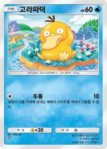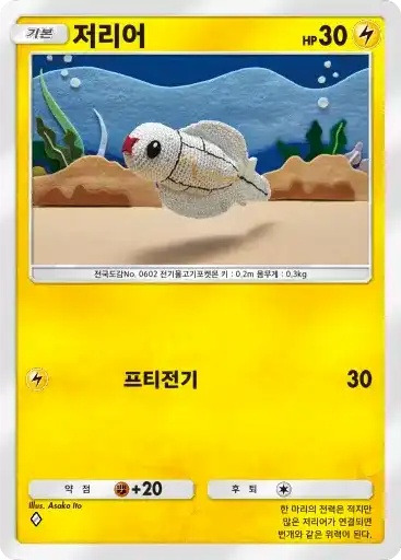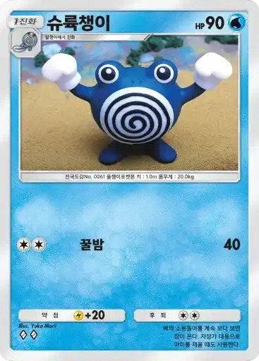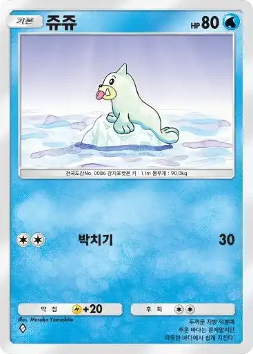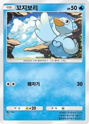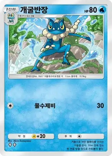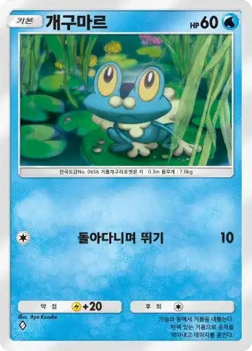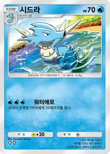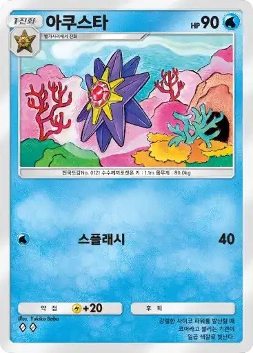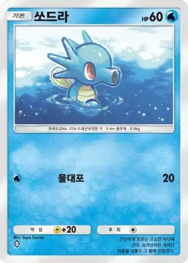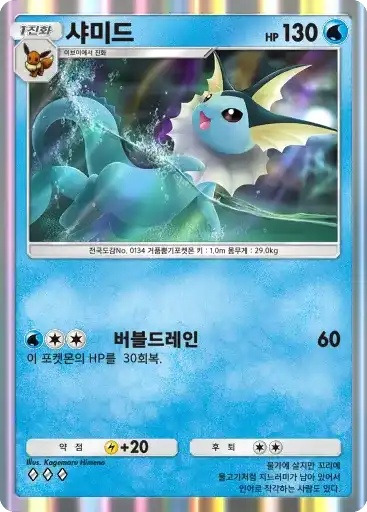 이슬 | 자신의 물 포켓몬을 1마리 선택한다. 뒷면이 나올 때까지 동전을 던져서 앞면이 나온 수만큼의 물 에너지를 자신의 에너지존에서 내보내 그 포켓몬에게 붙인다. | 피카츄 |