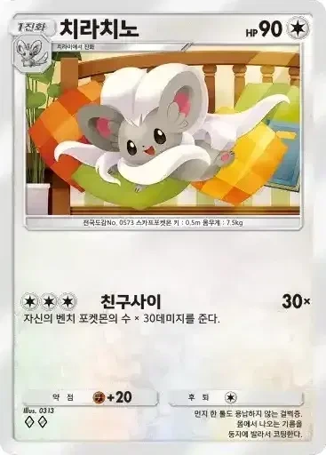 치라치노 | ⬜⬜⬜ 친구사이 (30x) ※ 자신의 벤치 포켓몬의 수 x 30데미지를 준다. |