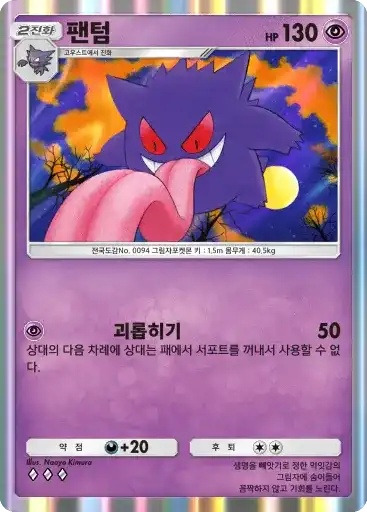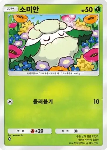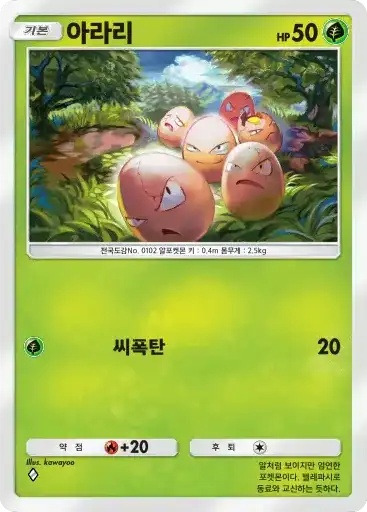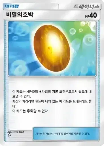 비밀의호박 | 이 카드는 HP40의 기본 타입의 기본 포켓몬으로서 필드에 내보낼 수 있다. 자신의 차례라면 필드에 나와 있는 이 카드를 트래쉬해도 좋다. 이 카드는 후퇴할 수 없다. |