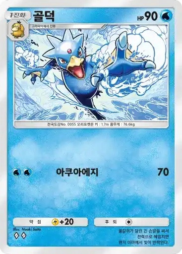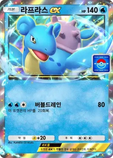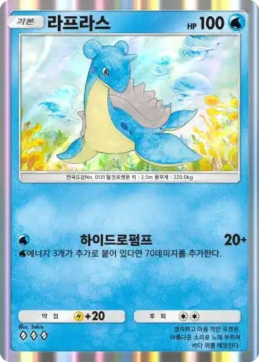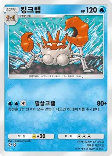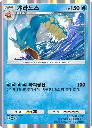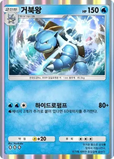 거북왕 | ⬛⬛⬜ 하이드로펌프 (80+) ※ 추가 효과: 물 에너지 2개가 추가로 붙어 있다면 60데미지를 추가한다. |