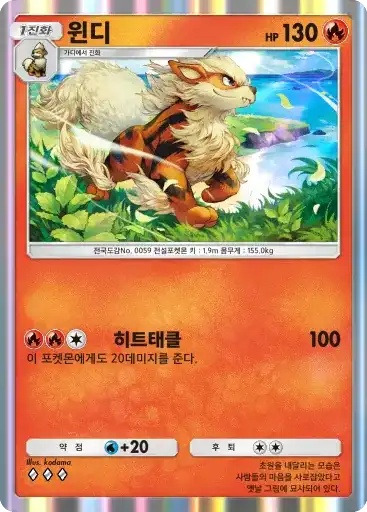 윈디 ex | ⬛⬛⬜ 맹화의돌진 (120) ※ 추가 효과: 이 포켓몬에게도 20데미지를 준다. |