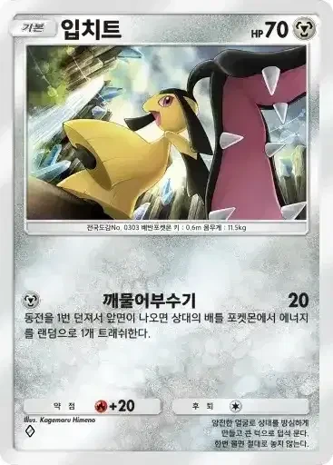 입치트 | ⬛ 깨물어부수기 (20) ※ 추가 효과: 동전을 1번 던져서 앞면이 나오면 상대의 배틀 포켓몬에서 에너지를 랜덤으로 1개 트래쉬한다. |