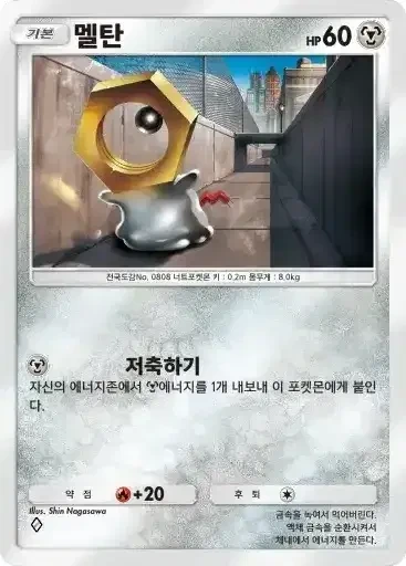멜탄 | ⬛ 저축하기 ※ 추가 효과: 자신의 에너지존에서 강철 에너지를 1개 내보내 이 포켓몬에게 붙인다. |