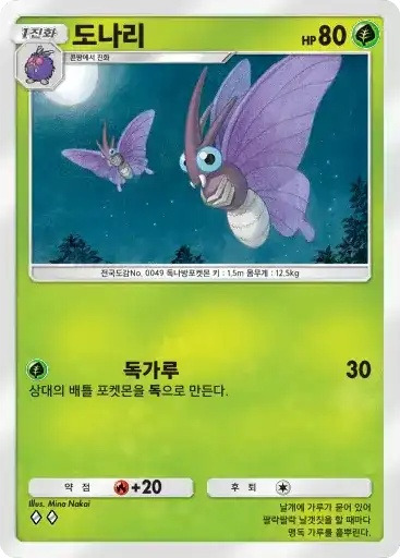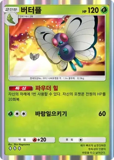 버터플 | 특성: 파우더힐 (자신의 차례에 1번 자신의 포켓몬 전원의 HP를 20회복) ⬛⬜⬜ 바람일으키기 (60) |