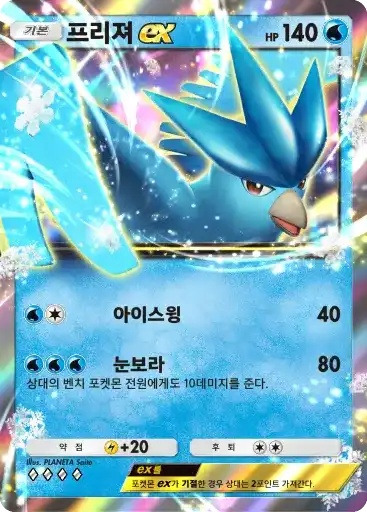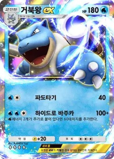 거북왕 ex | ⬛⬜ 파도타기 (40) ⬛⬛⬜ 하이드로 바주카 (100+) ※ 추가 효과: 물 에너지 2개가 추가로 붙어 있다면 60데미지를 추가한다. |
