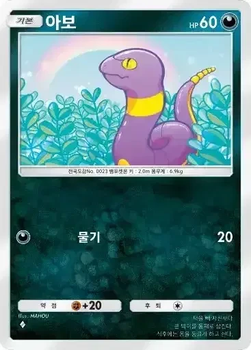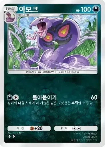 아보크 | ⬛⬜ 몰아붙이기 (60) ※ 추가 효과: 상대의 다음 차례에 이 기술을 받은 포켓몬은 후퇴할 수 없다. |