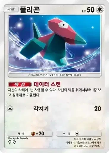 폴리곤 | 특성: 데이터 스캔 (자신의 차례에 1번 사용할 수 있다. 자신의 덱을 위에서부터 1장 보고 원래대로 되돌린다.) ⬜ 각지기 (20) |