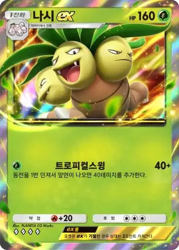 나시 ex | ⬛ 트로피컬스윙 (40+) ※ 추가 효과: 동전을 1번 던져서 앞면이 나오면 40데미지를 추가한다. |