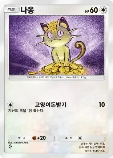 나옹 | ⬜ 고양이돈받기 (10) ※ 추가 효과: 자신의 덱을 1장 뽑는다. |