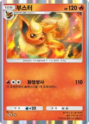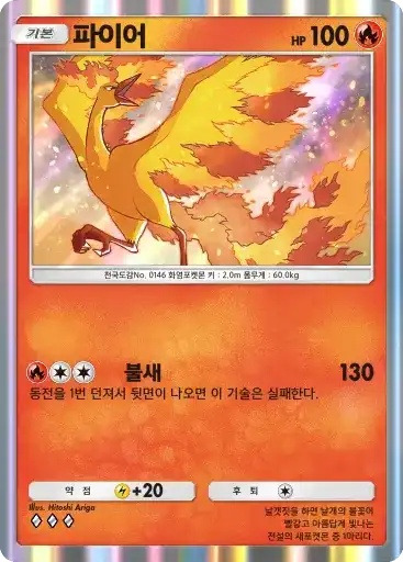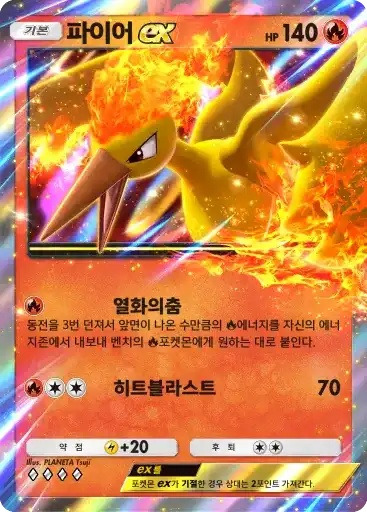 파이어 ex | ⬛ 열화의춤 ※ 추가 효과: 동전을 3번 던져서 앞면이 나온 수만큼 불 에너지를 자신의 에너지 존에서 내보내 벤치의 불 포켓몬에게 원하는 대로 붙인다. ⬛⬜⬜ 히트블라스트 (70) |