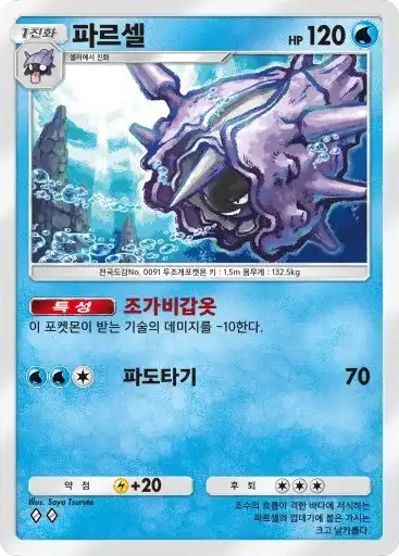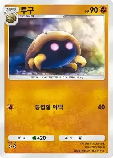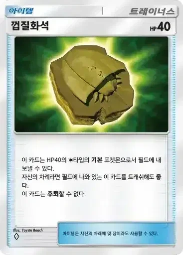 껍질화석 | 이 카드는 HP40의 기본 타입의 기본 포켓몬으로서 필드에 내보낼 수 있다. 자신의 차례라면 필드에 나와 있는 이 카드를 트래쉬해도 좋다. 이 카드는 후퇴할 수 없다. |