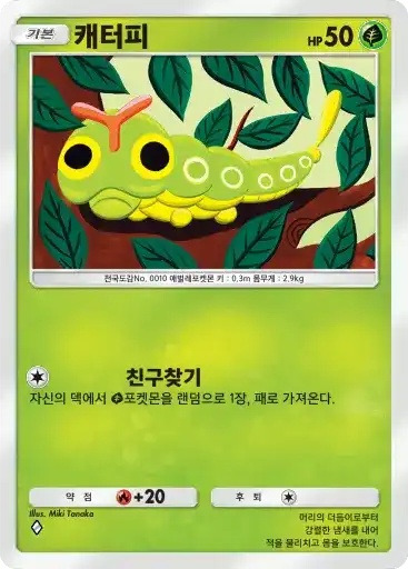 캐터피 | ⬜ 친구찾기 ※ 추가 효과: 자신의 덱에서 풀 포켓몬을 랜덤으로 1장, 패로 가져온다. |